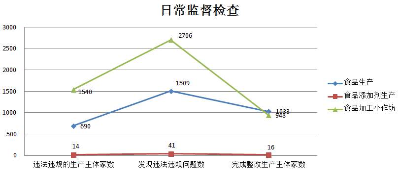 (二)食品日常监管情况1、食品生产环节日常监管情况 2018年上半年,全省日常监管工作中,共检查食品生产企业11514家、食品添加剂生产企业149家、食品加工小作坊22708家。出动检查人员83098人次,其中食品生产企业34166人次,食品添加剂生产企业630人次,食品加工小作坊48302人次。快检生产主体数2156家次,其中食品生产企业1025家次,食品添加剂生产企业1家次,快检食品加工小作坊1130家次;快检食品批次数5371批次,其中食品生产企业3347批次,食品添加剂生产企业1批次,快检食品加工小作坊2023批次;快检不合格食品批次数158批次,其中食品生产企业69批次,快检食品加工小作坊89批次。 日常监督检查中发现违法违规的生产主体数2244家次,其中食品生产企业690家次,食品添加剂生产企业14家次,食品加工小作坊1540家次;发现违法违规问题数4256个,其中食品生产企业1509个,食品添加剂生产企业41个,食品加工小作坊2706个;完成整改生产主体数2843家次,其中食品生产企业1033家次,食品添加剂生产企业16家次,食品加工小作坊948家次。 图2-1-22018年上半年食品日常监督检查情况表