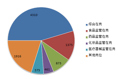 二、人员情况(一)行政机构人员情况2018年上半年,全省各级食品药品监管行政机构共有编制29226人,实际到岗26382人。 从所在部门看,综合在岗人员4310人,食品监管在岗人员1375人,药品监管在岗人员873人,化妆品监管在岗人员461人,AG百家乐娱乐监管在岗人员575人,其他岗位人员1916人。 图1-1-22018年上半年行政机构到岗人员所在部门分布图