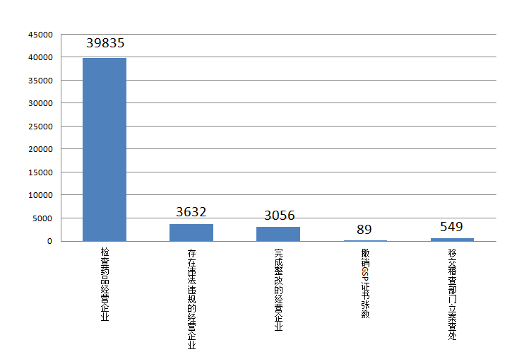 四、药品经营企业情况2018年上半年,全省期末实有企业数量30089家(其中生物制品7301家,专营中药材、中药饮片64家),本期新增2718家,本期减少2108家。 五、药品日常监管情况(一)药品生产企业日常监管情况2018年上半年,全省共检查生产企业1465家次,其中基本药物生产企业666家次,血液制品、注射剂等高风险品种生产企业126家次。出动检查人员4955人次,发现违法违规生产企业129家次,责令整改生产企业154家次,收回GMP证书8张,移交稽查部门立案查处38家。 图4-5-12018年上半年全省药品生产企业日常监管情况 (二)药品经营企业日常监管情况2018年上半年,全省共检查药品经营企业39835家次,其中批发企业1995家次,零售企业37840家次;存在违法违规的经营企业3632家次,其中批发企业243家次,零售企业3287家次;完成整改的经营企业3056家次,其中批发经营企业221家次,零售企业2835家次;撤销GSP证书89张,其中批发企业3张,零售企业86张;移交稽查部门立案查处549件,其中批发企业15件,零售企业534件。详见附表9。 图4-5-22018年上半年全省药品经营企业日常监管情况
